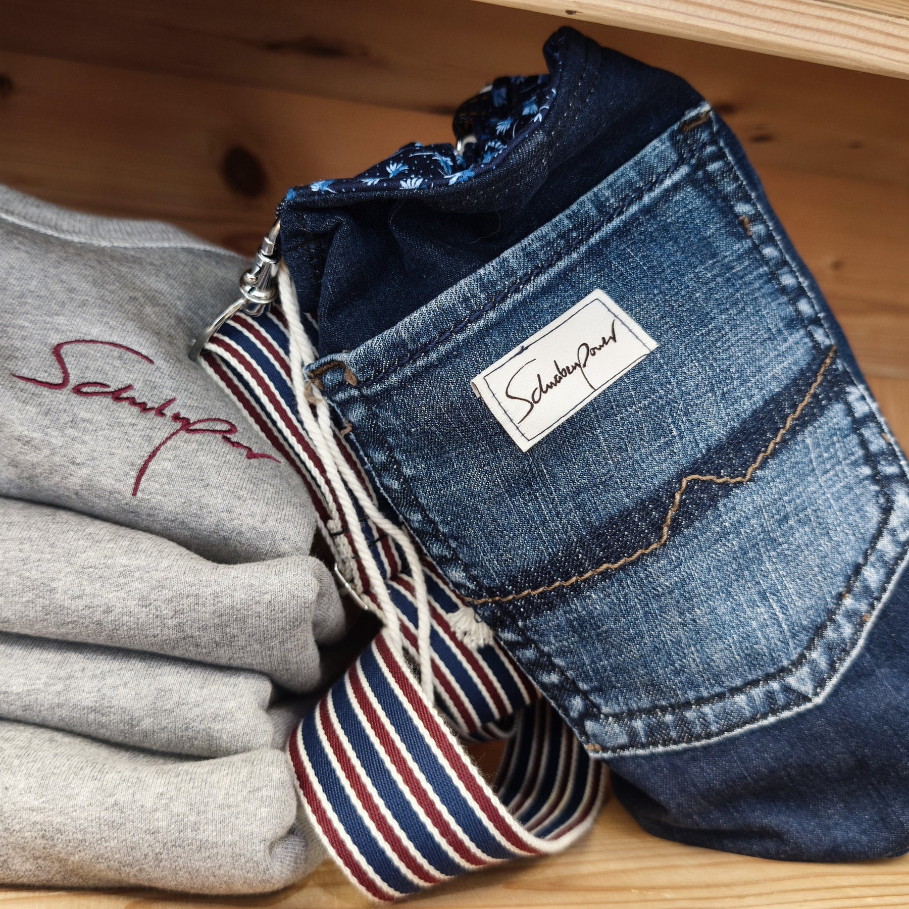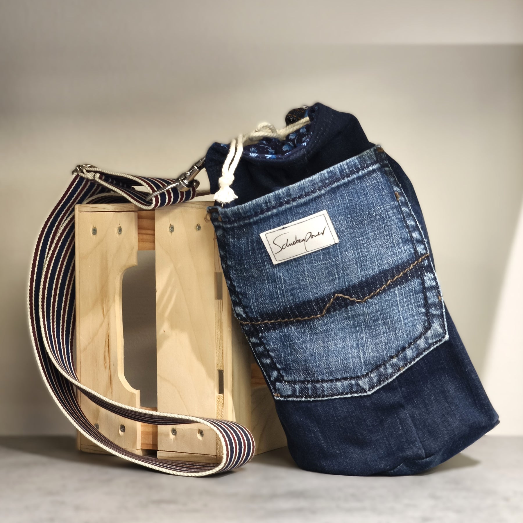 Ein Upcycling-Jeansbeutel mit Baumwollgurt - ein Unikat, das von Anja speziell für dich genäht wurde!